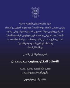 أسرة جامعة عمان الأهلية تنعي المرحوم أ.د. يعقوب حيدر حمدان