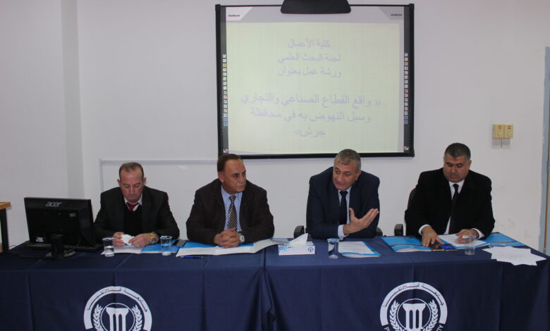 أقامت كلية الأعمال بالتعاون مع محافظة جرش ومديرية صناعة وتجارة جرش, ورشة عمل مشتركة بعنوان ” الواقع الصناعي والتجاري وسبل النهوض به في محافظة جرش ” في بداية اللقاء رحب الأستاذ الدكتور خالد السرطاوي عميد الكلية ونائب الرئيس بالضيوف الكرام وتحدث عن العلاقة بين الجامعة والمجتمع المحلي وأهميتها في العملية التعليمية,