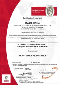 حصلت أورنج الأردن مؤخراً للمرة الثانية على شهادة المعيار الدولي الأوروبي للمساواة بين الجنسين(GEEIS) ، كما حازت لأول مرة على شهادة التنوّع تحت مظلة GEEIS والتي تعنى بتطبيق المعايير الخاصة بالأشخاص ذوي الإعاقة وتنوع الخلفيات الثقافية وهذا يعكس مدى التزامها بتطبيق مبدأ المساواة بين الجنسين والتنوّع في مكان العمل. وتصدر هذه الشهادات من قبل Bureau Veritas، وهي جهة مستقلّة تمنح هذا النوع من الشهادات.