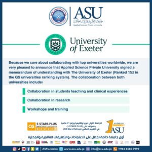 إيماناً بأهمية الشراكات مع الجامعات العالمية، وقعت كلية العلوم الطبية المساندة في جامعة العلوم التطبيقية الخاصة اتفاقية تعاون متبادل مع جامعة إكزيتير البريطانية