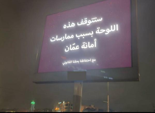 وقالت الامانة في بيان لها، ان الشركة قامت بتوظيف هذه اللوحات الإعلانية الالكترونية بطريقة غير قانونية ولم تحصل على موافقة امانة عمان المسبقة.