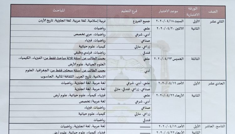 واعلنت وزارة التربية والتعليم جدول الاختبارات، التي ستتم من خلال جلسات لمدة ساعتين لكل جلسة وفق البرنامج المعد، وعلى شكل اوراق امتحانية، تشمل مادة دراسية واحدة او أكثر، وبأسئلة موضوعية من نوع اختيار من متعدد.