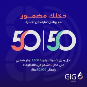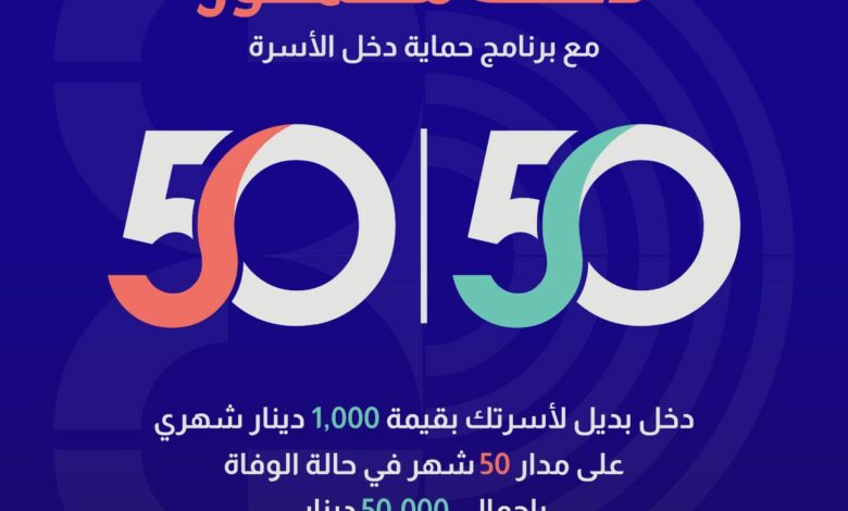 مع برنامج حمایة دخل الأسرة 50/50، اضمن لعائلتك دخل شھري ثابت بقیمة 1000 دینار شھري على مدار 50 شھر في حالة الوفاة بقسط سنوي ثابت على مدار 5 سنوات.