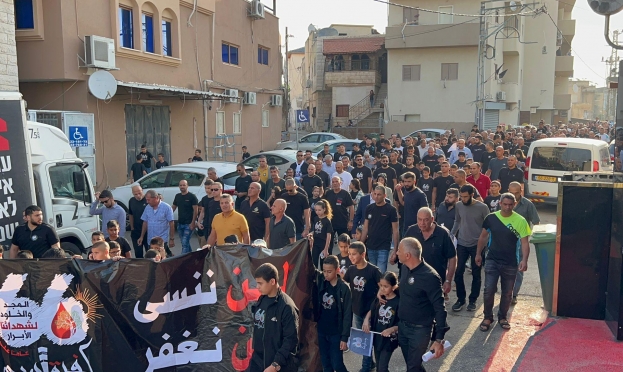 ورفع المشاركون الأعلام الفلسطينية إلى جانب الأعلام السوداء حدادا على الشهداء، كما رفعوا صور ضحايا المجزرة، مرددين هتافات منددة بسياسة حكومة الاحتلال، التي طالبوها بالاعتراف بالمجزرة وتحمل مسؤوليتها.