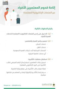 وتضمن التسجيل ثلاث خطوات أساسية شملت الدخول على إحدى المنصات الإلكترونية المعتمدة لخدمات العمرة للأفراد،وتصميم برنامج العمرة والمتضمن خدمات السكن والنقل، إضافة الى استكمال متطلبات التأشيرة التي سيتم إصدارها إلكترونيا ليتمكن المعتمر من طباعتها مباشرة.