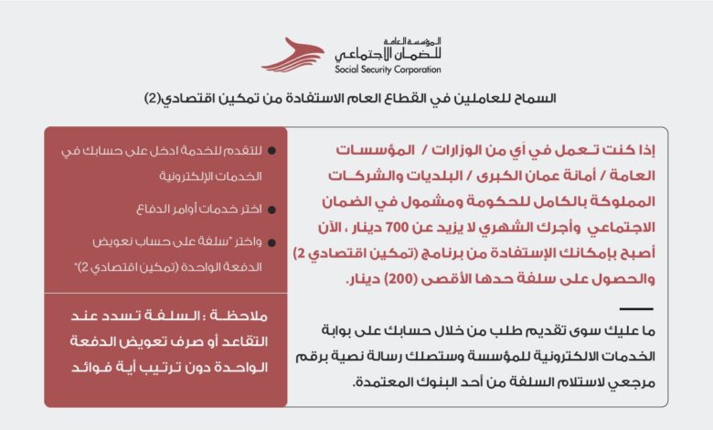 أعلنت المؤسسة العامة للضمان الاجتماعي أنه تقرر التوسع بالشرائح المستفيدة من برنامج تمكين اقتصادي (2) وذلك بالسماح للمؤمن عليهم العاملين حالياً في منشآت القطاع العام (الوزارات والمؤسسات العامة وأمانة عمان والبلديات والشركات المملوكة بالكامل للحكومة) الحصول على سلفة على حساب تعويض الدفعة الواحدة.