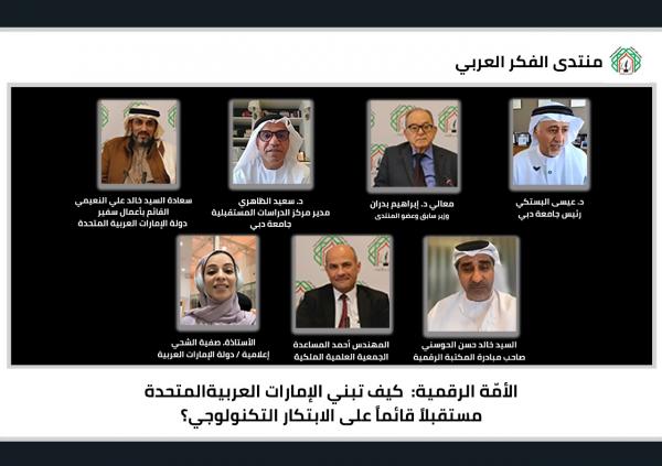 عقد منتدى الفكر العربي، بحضور القائم بأعمال سفير دولة الإمارات العربية المتحدة السيد خالد علي النعيمي، لقاءً حوارياً وجاهياً وعبر تقنية الاتصال المرئي، حاضر فيه مدير مركز الدراسات المستقبلية في جامعة دبي د.سعيد الظاهري حول مضامين كتابه “الأمة الرقمية: كيف تبني الإمارات العربية المتحدة مستقبلاً قائماً على الابتكار التكنولوجي؟”، وشارك بالمداخلات، في هذا اللقاء الذي أدراه مستشار رئيس جامعة فيلادلفيا للعلاقات الدولية والوزير الأسبق وعضو المنتدى د.إبراهيم بدران كل من: رئيس جامعة دبي د.عيسى البستكي، والإعلامية الإماراتية الأستاذة صفية الشحي، ورئيس قسم الإدارة المجتمعية في شركة بترول أبو ظبي الوطنية ADNOC وصاحب مبادرة المكتبة الرقمية في الإمارات السيد خالد حسن الحوسني، ورئيس قطاع تكنولوجيا المعلومات والاتصالات للتنمية في الجمعية العلمية الملكية المهندس أحمد المساعدة، وحضر اللقاء القائم بأعمال أمين عام المنتدى السيد كايد هاشم وعدد من المتخصصين في قطاع التكنولوجيا في الجمعية العلمية الملكية وعدد من المهتمين.
