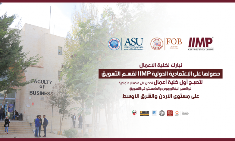 حصل قسم التسويق في كلية الأعمال ببرنامجيه البكالوريوس والماجستير على الإعتمادية الدولية IIMP والتي تمنحها الهيئة الدولية للمسوقين المحترفين ومقرها كندا، لتسجل بذلك كلية الأعمال في جامعة العلوم التطبيقية الخاصة قفزة نوعية وعلامة فارقة كأوّل كلّية تحصل على هذه الإعتمادية لبرنامجي البكالوريوس والماجستير في التسويق على مستوى الأردن والشرق الأوسط.