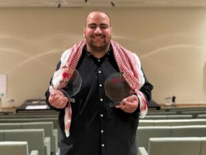 – الطالب يوسف النجار، مشرفه الأكاديمي في المسابقة الدكتور محمود بشايرة.