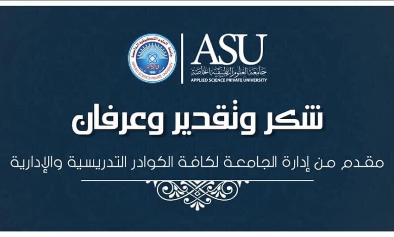 تتقدم إدارة جامعة العلوم التطبيقية الخاصة ممثلة بنائب رئيس مجلس الأمناء الدكتور هيثم أبو خديجة، ورئيسها الأستاذ الدكتور محفوظ جودة، ونائب الرئيس الأستاذ الدكتور إيمان البشيتي بخالص الشكر والامتنان لكوادرها التدريسية والإدارية، ولطلبتها المتميزين، ولكل من بذل مجهود لإنجاح استمرارية العملية التعليمية عن بعد.