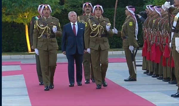 ولدى وصول جلالة الملك إلى موقع الحفل محاطا بالموكب الأحمر، أطلقت المدفعية 21 طلقة تحية لجلالته، فيما استعرض جلالته حرس الشرف الذي اصطف لتحيته، وعزفت الموسيقى السلام الملكي.