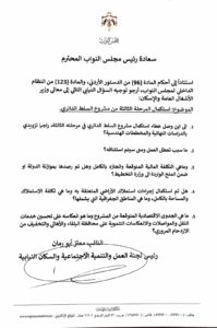 وجه النائب معتز أبو رمان، رئيس لجنة العمل والتنمية الاجتماعية والسكان النيابية، سؤالًا نيابيًا إلى وزير الأشغال العامة والإسكان حول استكمال المرحلة الثالثة من مشروع السلط الدائري، وذلك استنادًا لأحكام المادة (96) من الدستور الأردني والمادة (123) من النظام الداخلي لمجلس النواب.