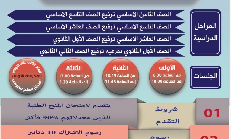 تعلن إدارة مدارس النظم الحديثة عن عقد امتحان المنح السنوية الكلية والجزئية للعام الدراسي 2021/2020، وذلك يوم السبت الموافق 21/3/2020، علما أن الامتحان سيكون الكترونيا (محوسبا)