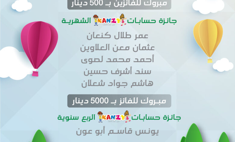 كشف بنك صفوة الإسلامي مؤخراً عن أول فائز بجائزة السحب ربع السنوي لحساب توفير الأطفال “كنزي”، والبالغة قيمتها 5 آلاف دينار أردني، معلناً أيضاً عن أسماء الفائزين بسحب شهر آذار الخمسة، والذين أضيف لرصيد كل منهم مبلغاً نقدياً قدره 500 دينار أردني.