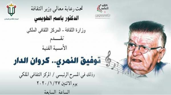تحت رعاية وزير الثقافة الدكتور باسم الطويسي، يقيم المركز الثقافي الملكي الاثنين، حفلاً استذكارياً للفنان الراحل توفيق النمري ضمن برنامج قامات، وستحل الأمسية الثقافية اسم “توفيق النمري..كروان الدار”.