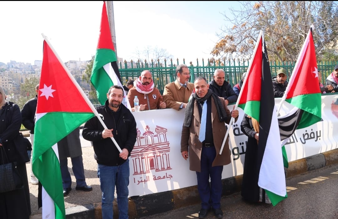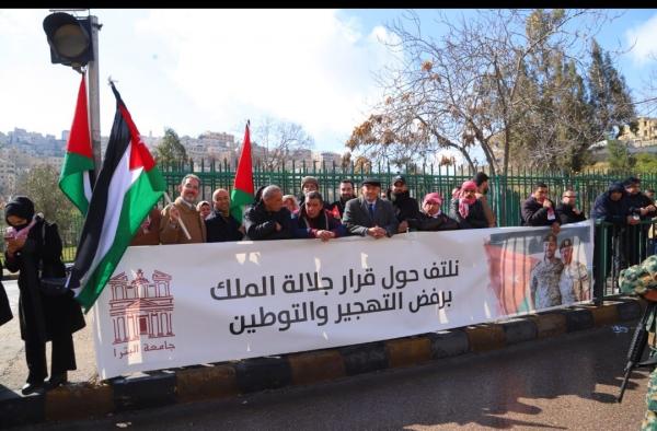 وحمل المشاركون الأعلام الأردنية وصور جلالة الملك وولي العهد، ورفعوا شعارات تؤكد دعم الأردن الثابت للقضية الفلسطينية، ورفض أي محاولات لتهجير الفلسطينيين أو المساس بحقوقهم التاريخية.