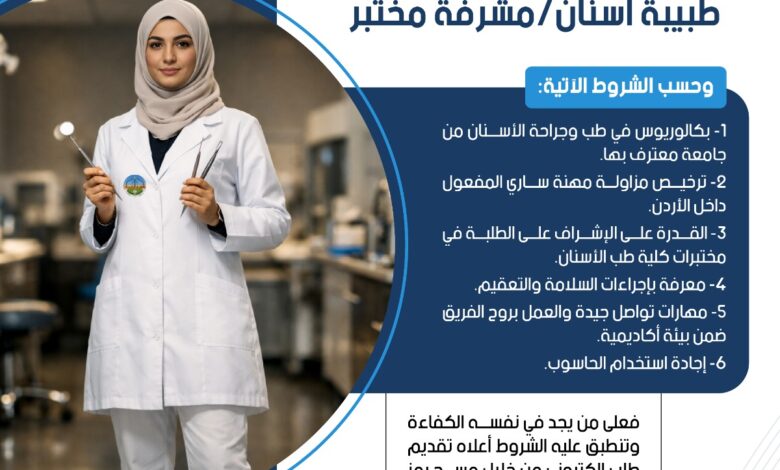 جامعة الزرقاء تعلن عن حاجتها لتعيين طبيبة اسنان/ مشرفة مختبر 08/04/2026 08/04/2026 فيسبوك تويتر ماسنجر ماسنجر واتساب ڤايبر مشاركة عبر البريد طباعة