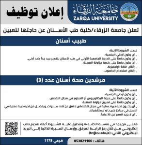 جامعة الزرقاء تعلن عن شاغر وظيفي في كلية طب الأسنان 18/02/2025 18/02/2025 فيسبوك تويتر ماسنجر ماسنجر واتساب ڤايبر مشاركة عبر البريد طباعة