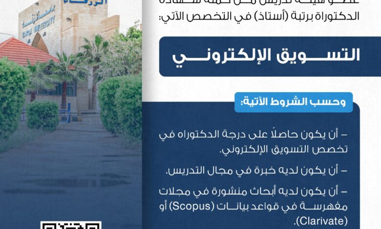 جامعة الزرقاء تعلن عن شواغر أكاديمية في “التسويق الإلكتروني”