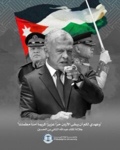 حفظ الله جلالة الملك عبد الله الثاني بن الحسين، وولي عهده الأمين، وأدامهما ذُخرًا للأردنِّ والأمتينِ العربيةِ والإسلاميةِ.