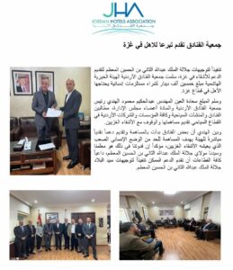 تنفيذاً لتوجيهات جلالة الملك عبدالله الثاني بن الحسين المعظم لتقديم الدعم للأشقاء في غزة، سلمت جمعية الفنادق الأردنية الهيئة الخيرية الهاشمية مبلغ خمسين ألف دينار لشراء مستلزمات إنسانية يحتاجها الأهل في قطاع غزة.