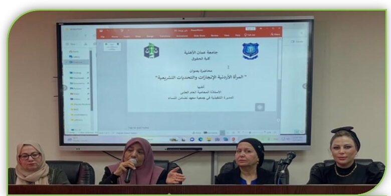 نظمت كلية الحقوق في جامعة عمّان الأهلية يوم الثلاثاء 7 / 4 / 2026 محاضرة توعوية متخصصة بعنوان “المرأة الأردنية: الإنجازات والتحديات التشريعية”، قدمتها الأستاذة المحامية أنعام العشا، المديرة التنفيذية في جمعية معهد تضامن النساء، وسعادة الدكتورة أدب السعود، وذلك بإشراف كل من الدكتورة أمل الرفوع والدكتورة إيمان الوريكات في قاعة “موسى الساكت”، بحضور عدد من أعضاء الهيئة التدريسية وطلبة الكلية.