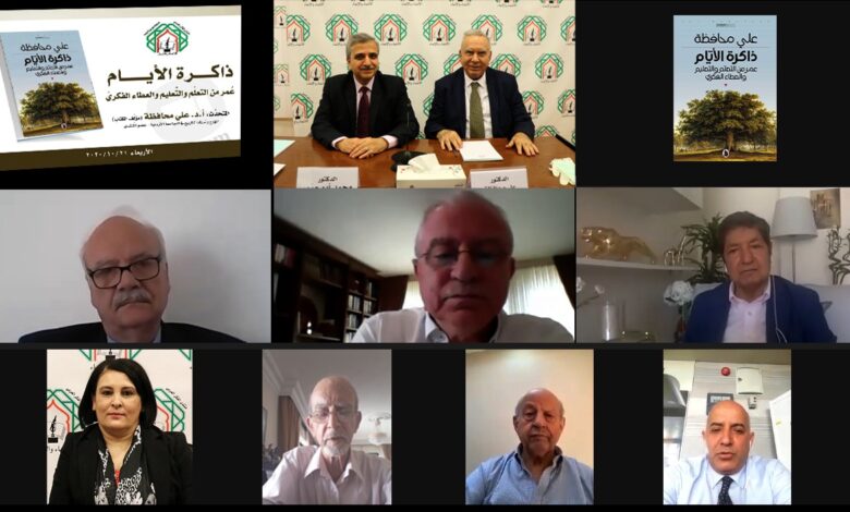 عمّان – نظم منتدى الفكر العربي، يوم الأربعاء 21/10/2020، من خلال تقنية الاتصال المرئي، لقاءً حول سيرة ومذكرات د. علي محافظة أستاذ التاريخ الحديث والمعاصر في الجامعة الأردنية وعضو المنتدى، التي صدرت مؤخراً بعنوان “ذاكرة الأيام، عمر من التعلّم والتعليم والعطاء الفكري”، وتناول د.محافظة في المحاضرة التي ألقاها مراحل سيرته منذ البدايات في قريته، ودراسته في جامعة دمشق، وعمله في التعليم والسلك الدبلوماسي في بعض العواصم الأوروبية والعربية، ثم عمله في الميدان الأكاديمي ورئاسته لجامعة مؤتة وجامعة اليرموك ورئاسته للجنة إصلاح التعليم في أواسط الثمانينيات المنبثقة عن مبادرة رعاها سمو الأمير الحسن بن طلال، وإنتاجه الفكري في البحث التاريخي والدراسات.