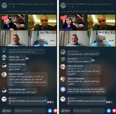 نظم أصدقاء منتدى مؤسسة عبد الحميد شومان الثقافي يوم 13-7-2020 حوارية بعنوان تقييم تجربة التعليم الجامعي عن بعد “في ظل جائحة كورونا” تم بثها على منصة زووم، وعلى صفحة المؤسسة على فيسبوك، بعنوان تقييم تجربة التعليم الجامعي عن بعد، شارك فيها أستاذ علم الفيروسات في كلية الطب بالجامعة الأردنية معالي أ. د. عزمي محافظة، ورئيس الجامعة الأميركية في مادبا أ.د. نبيل أيوب، وخبير تقنية المعلومات أ.د. مصطفى ياسين – العميد الاسبق لكلية تقنية المعلومات بجامعة عمان الاهلية، وادارت الحوارية أستاذة الأدب الحديث والدراسات الثقافية في الجامعة الأمريكية في مادبا د. شهلا العجيلي.
