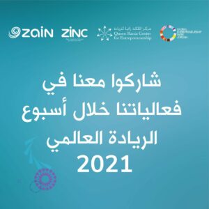 تدعوكم شركة زين من خلال منصّتها للإبداع (ZINC)، وبالتعاون مع مركز الملكة رانيا للريادة في جامعة الأميرة سمية للتكنولوجيا للمشاركة بفعاليات أسبوع الريادة العالمي 2021 والتي ستعقدها في مجالات ريادة الأعمال في فروع منصّة زين للإبداع في مختلف محافظات المملكة من 8-14 تشرين الثاني