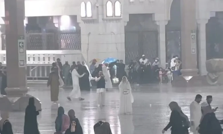 ووثّقت قناة الإخبارية عبر مقاطع مصوّرة لحظات هطول المطر في أروقة المسجد النبوي، حيث ظهر المصلون يرفعون أكفّهم بالدعاء وسط أجواء إيمانية مفعمة.