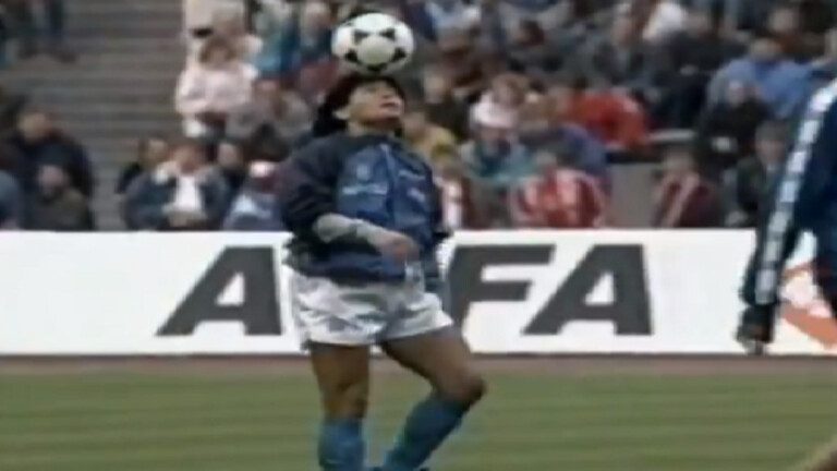 ويظهر مقطع الفيديو مارادونا، وهو يجري الإحماء “التسخين”، قبل مباراة فريقه نابولي أمام بايرن ميونيخ في الدور نصف النهائي لكأس الاتحاد الأوروبي لكرة القدم، والتي أقيمت يوم 19 أبريل 1989