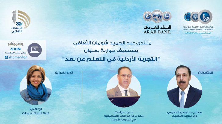يعقد منتدى عبد الحميد شومان الثقافي، ذراع البنك العربي للمسؤولية الثقافية والاجتماعية، عند السادسة والنصف من مساء غد الإثنين، حوارية حول التعليم عن بعد عبر منصة “زووم”، وصفحة مؤسسة شومان على “فيسبوك”.
