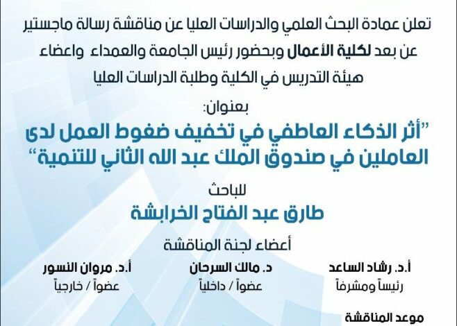 “عمان العربية”.. مناقشة رسالة الماجستير العاشرة عن بعد 28/04/2020 28/04/2020 فيسبوك تويتر ماسنجر ماسنجر واتساب ڤايبر مشاركة عبر البريد طباعة