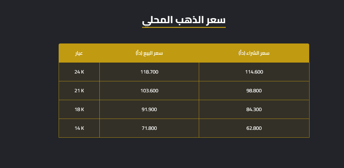 وبلغت أسعار عيارات 24 و18 و14 لغايات البيع من محلات الصاغة عند 118.7 دنانير و 91.9 و71.8 دينارا على التوالي.