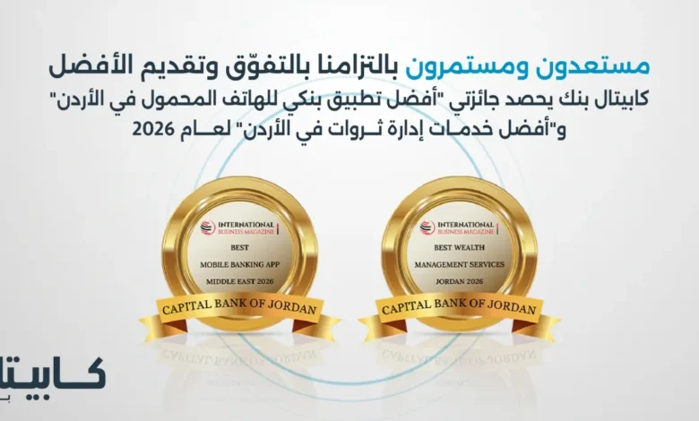 أعلن كابيتال بنك عن فوزه بجائزتين مرموقتين ضمن جوائز مجلة International Business Magazine لعام 2026، وهما جائزة “أفضل تطبيق للخدمات المصرفية عبر الهاتف المحمول في الشرق الأوسط” وجائزة “أفضل خدمات إدارة ثروات في الأردن”، في إنجاز جديد يعكس التزام البنك المتواصل بتقديم حلول مصرفية مبتكرة وتعزيز جودة الخدمات المقدمة لعملائه.