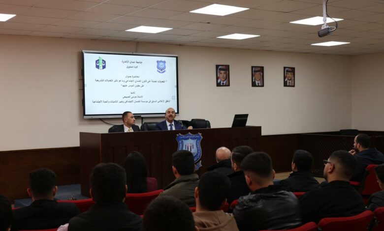 نظّمت كلية الحقوق في جامعة عمان الأهلية مؤخراً ندوة علمية متخصصة بعنوان “التعديلات الحديثة على قانون الضمان الاجتماعي وأثرها على حقوق المؤمن عليهم”، بحضور واسع من طلبة الكلية وعدد من أعضاء الهيئة التدريسية.