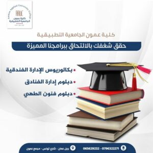 استعد لتحقيق أحلامك بسهولة مع كلية عمون الجامعية التطبيقية دبلوم إدارة الفنادق سارعوا بالتسجيل الان .. للتواصل والاستفسار : 0796322271 _ 065629232 موقعنا : جبل عمان - شارع تونس - مجمع عمون