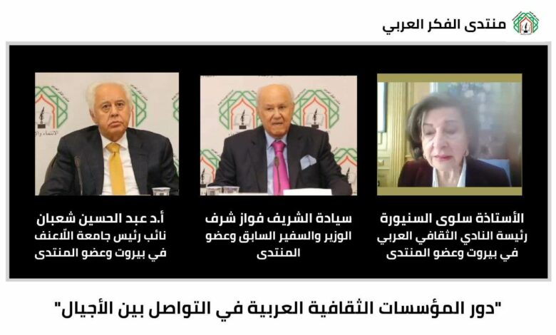 عقد منتدى الفكر العربي، يوم الخميس 26/1/2023، لقاءً حوارياً وجاهياً وعبر تقنية الاتصال المرئي، حاضرت فيه رئيسة النادي الثقافي العربي الأستاذة سلوى السنيورة بعاصيري حول “دور المؤسسات الثقافية العربية في التواصل بين الأجيال”، وشارك بالمداخلات في هذا اللقاء الذي أداره الوزير والسفير الأسبق وعضو المنتدى الشريف فواز شرف، كل من نائب رئيس جامعة اللّاعنف في بيروت وعضو المنتدى د.عبد الحسين شعبان ورئيس مجلس جامعة كردستان وعضو المنتدى د.شيرزاد النجار، والوزير الأسبق ومستشار الرئيس للعلاقات الدولية في جامعة فيلادلفيا وعضو المنتدى د.إبراهيم بدران، وحضر اللقاء عدد من الأكاديميين والمهتمين.