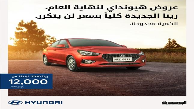 أعلنت مؤسسة الوحدة للتجارة -هيونداي الأردن، إطلاق عرض هيونداي لنهاية العام على سيارة رينا  2020 الجديدة، حيث ستتوفر بسعر استثنائي يبلغ  12000 دينار فقط لمدة محدودة وحتى نفاذ الكمية.