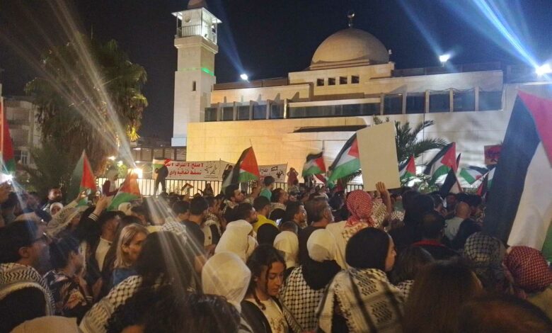 ورفع المشاركون العلمين الأردني والفلسطيني، وهتفوا “خيبر خيبر يا يهود جيش محمد سوف يعود”، إضافة الى العديد من الهتافات المنددة بالاحتلال الاسرائيلي.