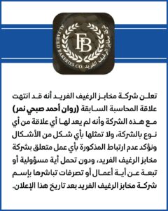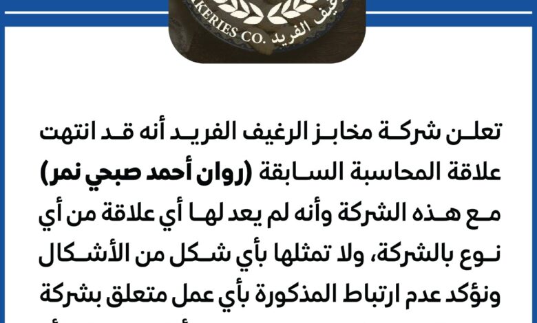مخابز الرغيف الفريد تعلن انتهاء علاقة المحاسبة السابقة بالشركة 20/04/2026 20/04/2026 فيسبوك تويتر ماسنجر ماسنجر واتساب ڤايبر مشاركة عبر البريد طباعة