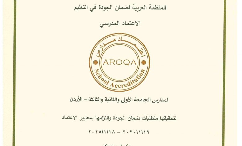 حصلت مدارس الجامعة بفروعها ( الاولى والثانية والثالثة ) على شهادة ضمان الجودة من المنظمة العربية لضمان الجودة في التعليم ” الاعتماد المدرسي ” في بروكسل