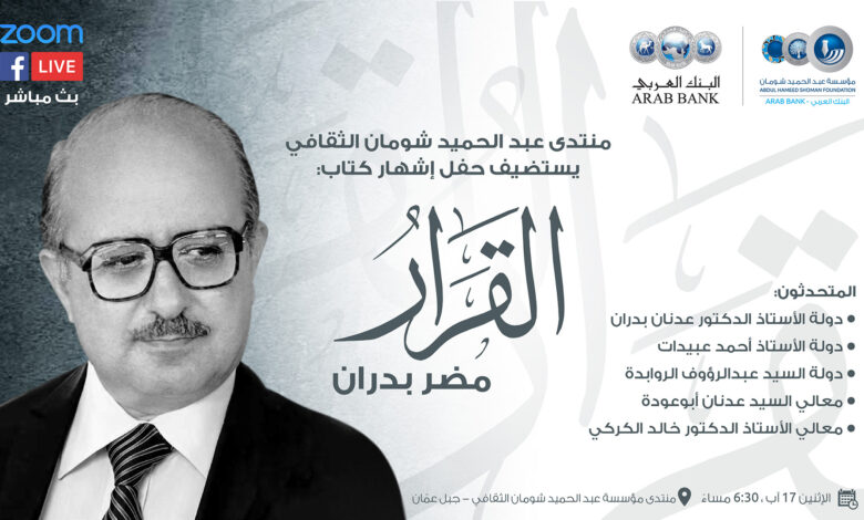 يشهر رئيس الوزراء الأسبق مضر بدران مذكراته السياسية، الإثنين، في منتدى عبد الحميد شومان الثقافي، عبر تطبيق “زوم” وصفحة المؤسسة على فيسبوك.