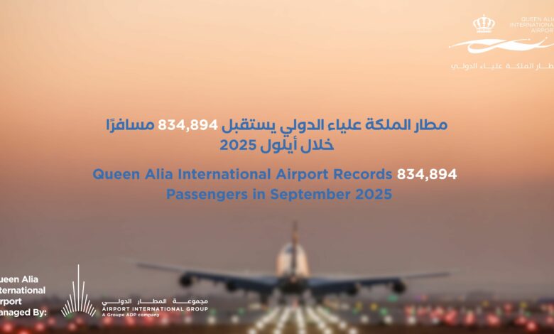 أعلنت “مجموعة المطار الدولي” أن مطار الملكة علياء الدولي استقبل 834,894 مسافرًا خلال أيلول 2025، مسجّلًا ارتفاعًا ملحوظًا نسبته 15.7% مقارنة بالفترة نفسها من العام الماضي. وفيما يتعلق بحركة الطائرات، سجّل المطار خلال الشهر 6,965 حركة، بارتفاع قدره 16.9% مقارنة بالعام الماضي، في حين بلغت حركة الشحن الجوي 6,282 طنًا، والتي تمثّل ارتفاعًا نسبته 10% مقارنة بشهر أيلول 2024.