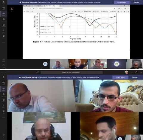 نوقشت يوم الخميس الموافق9-4-2020 في قسم هندسة الالكترونيات والاتصالات / كلية الهندسة / جامعة عمان الاهلية، رسالتي ماجستير عن بعد بحضور نائب رئيس الجامعة وعميد كلية الدراسات العليا الأستاذ الدكتور ميشيل سويدان وعميد كلية الهندسة الأستاذ الدكتور بسام المحاسنة ، وكانت الرسالة الأولى بعنوان (تصميم و تحسين شريط هوائي مستطيل متغير لتطبيقات 60 جيجاهيرتز باستخدام مادة الجرافين) والرسالة الثانية بعنوان (هوائي مدمج لتطبيقات النطاق العريض الفائق بناءً على مادة الجرافين).