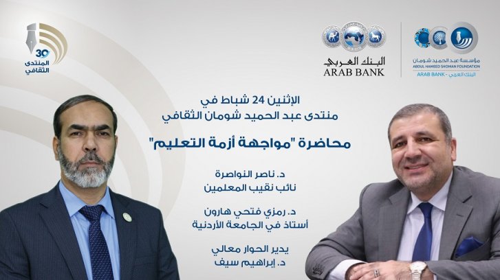 يستضيف منتدى عبد الحميد شومان، ذراع البنك العربي للمسؤولية الاجتماعية والثقافية، عند السادسة والنصف، غداً الإثنين محاضرة “مواجهة أزمة التعليم”، يشارك فيها نائب نقيب المعلمين د. ناصر النواصرة، ومستشار المركز الوطني الأعلى لتطوير المناهج وأستاذ الجامعة الأردنية د. رمزي هارون.