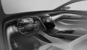 وأدى تطوير توسان 2021 الى دمج الوظائف المختلفة لشاشات العرض داخل السيارة لتكون باللمس، بحيث أعيد تصميم لوحة القيادة على نحو ناعم بدون بروز، لتكون أكثر سلاسة في الاستخدام وانسيابية وأسهل لقراءة المعلومات من عليها أثناء قيادة السيارة. وتنحي الحافة العريضة للوحة لتلتقي مع الحافة العريضة للباب من الداخل بتلقائية، تحيط خطوط فضية بالواجهة الأمامية وتتحرك في نعومة وصولاً للمقاعد الخلفية في السيارة لتعطي فخامة على المقصورة الداخلية.