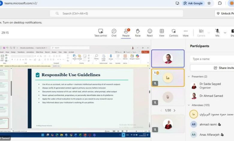 وقد تناولت الورشة أيضا عدة محاور تضمنت النزاهة الأكاديمية والمخاطر الأخلاقية وخصوصية البيانات في استخدام الذكاء الاصطناعي وآليات الإفصاح والشفافية عند استخدام مختلف أدوات الذكاء الاصطناعي.