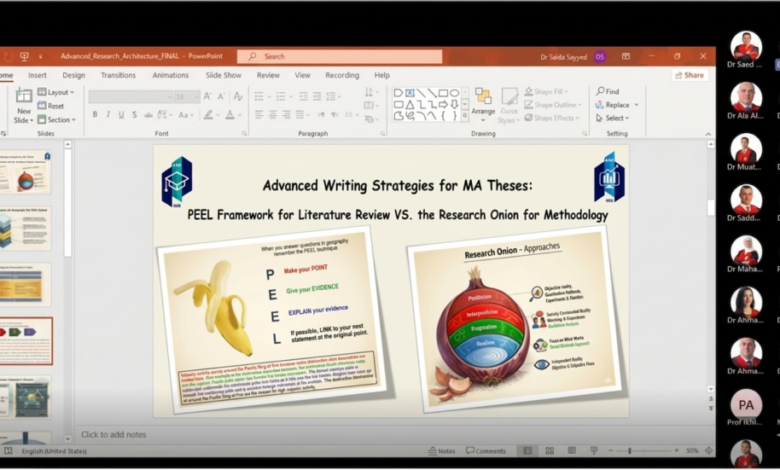 في إطار السعي المستمر لتطوير المهارات البحثية لدى طلبة الدراسات العليا، وبهدف تعزيز الممارسات الإشرافية في توعية الطلبة وتوجيههم نحو إتقان مهارات الكتابة الأكاديمية الرصينة وإعداد أطروحات علمية تتسم بالعمق المنهجي، نظمت كليتا الدراسات العليا والأعمال ورشة عمل علمية متخصصة بعنوان “استراتيجيات الكتابة المتقدمة في كتابة الرسائل الجامعية: إطار PEEL للأدبيات السابقة وبصلة البحث لمنهجية البحث العلمي”.