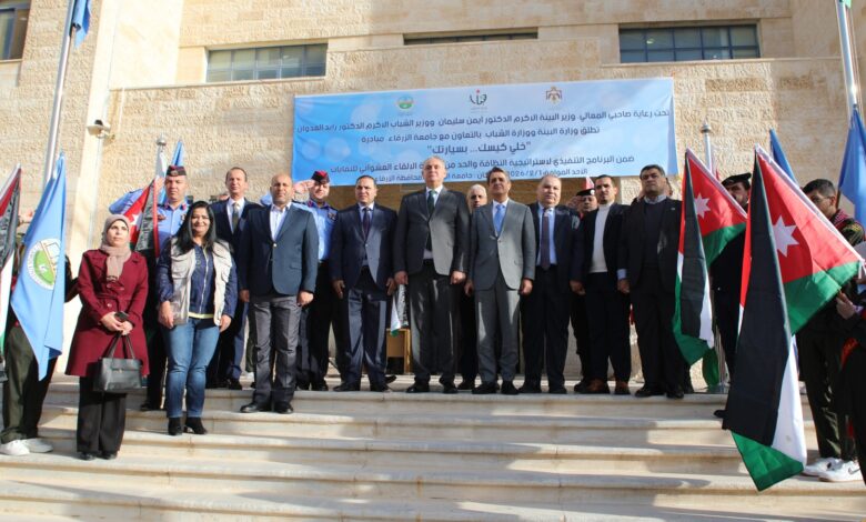 تحت رعاية معالي وزير البيئة الدكتور أيمن سليمان، ومعالي وزير الشباب الدكتور رائد العدوان، وبحضور عطوفة محافظ الزرقاء الدكتور فراس أبو قاعود، وسعادة رئيس مجلس إدارة شركة الزرقاء للتعليم والاستثمار الدكتور محمود أبو شعيرة، أطلقت وزارتا البيئة والشباب، اليوم الأحد الموافق 1 شباط 2026، وبالتعاون مع جامعة الزرقاء، مبادرة بيئية بعنوان “خلي كيسك بسيارتك”، وذلك ضمن البرنامج التنفيذي لاستراتيجية النظافة الوطنية والحد من ظاهرة الإلقاء العشوائي للنفايات.